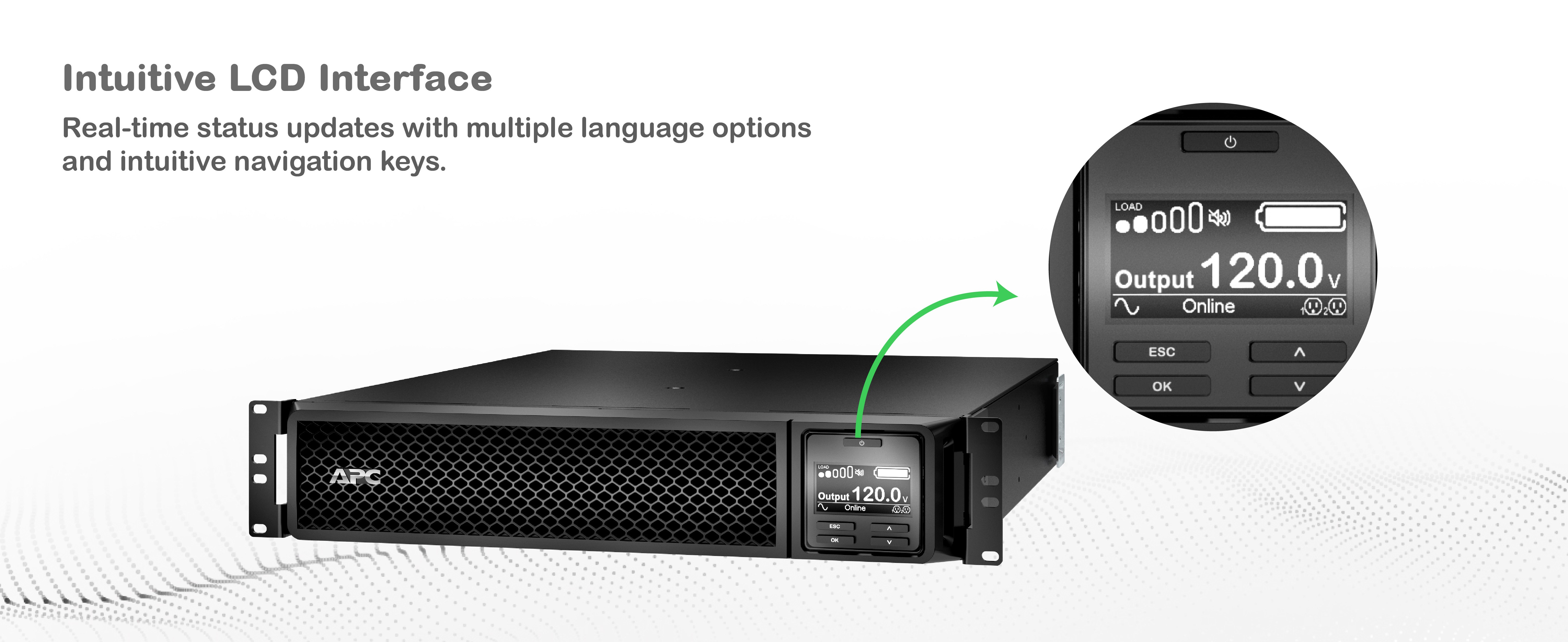 Graphical LCD display Quick, easy-to-read, intuitive LCD provides information about the utility and UPS conditions. |