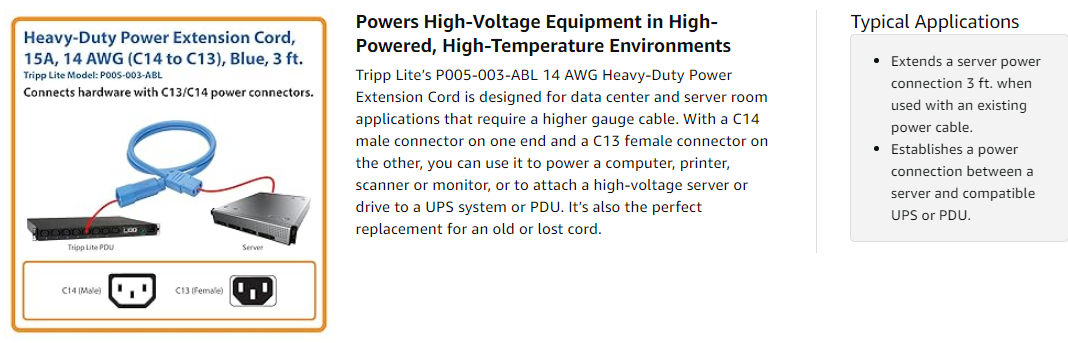 With support for up to 250V, this three-foot 15A cord is compatible with all C13-equipped hardware. It’s UL-listed and features a flexible SJT jacket and 14 AWG wire for easy routing through tight areas.