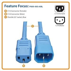 The P005-003-ABL features a blue SJT jacket and fully molded blue ends, allowing you to easily identify your connections in a crowded rack or workstation.