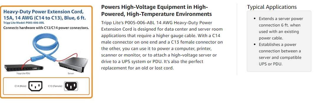 With support for up to 250V, this six-foot 15A cord is compatible with all C13-equipped hardware. It’s UL-listed and features a flexible SJT jacket and 14 AWG wire for easy routing through tight areas.