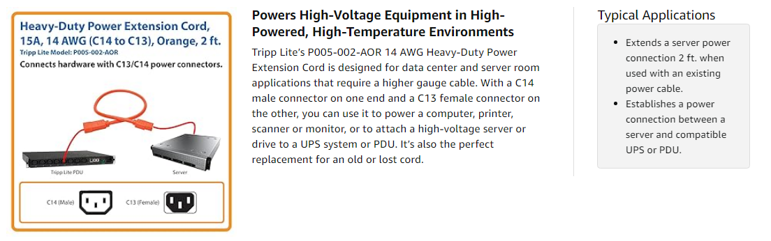 With support for up to 250V, this two-foot 15A cord is compatible with all C13-equipped hardware. It’s UL-listed and features a flexible SJT jacket and 14 AWG wire for easy routing through tight areas.