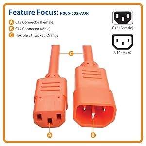 The P005-002-AOR features an orange SJT jacket and fully molded orange ends, allowing you to easily identify your connections in a crowded rack or workstation.