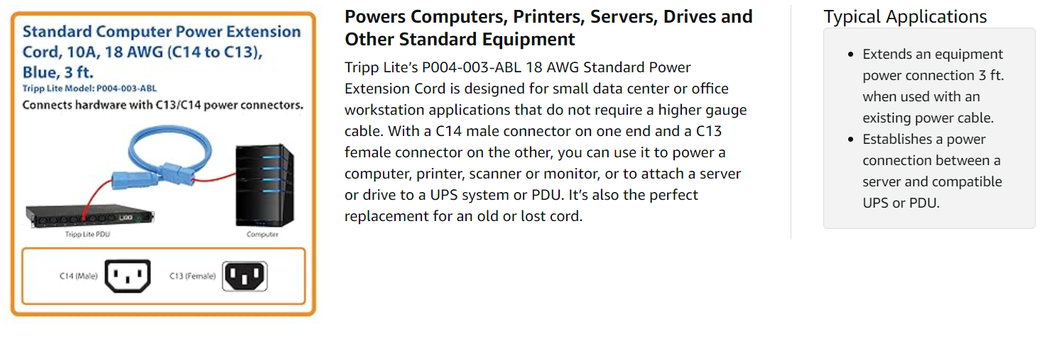 With support for up to 250V, this three-foot 10A cord is compatible with all C13-equipped hardware. It’s UL-listed and features a flexible SJT jacket and 18 AWG wire for easy routing through tight areas.
