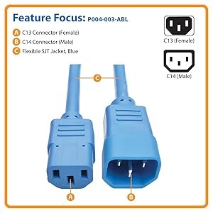 The P004-003-ABL features a blue SJT jacket and fully molded blue ends, allowing you to easily identify your connections in a crowded rack or workstation.