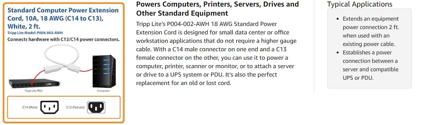 With support for up to 250V, this two-foot 10A cord is compatible with all C13-equipped hardware. It’s UL-listed and features a flexible SJT jacket and 18 AWG wire for easy routing through tight areas.