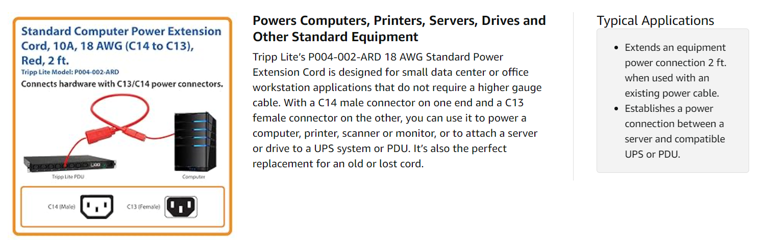With support for up to 250V, this two-foot 10A cord is compatible with all C13-equipped hardware. It’s UL-listed and features a flexible SJT jacket and 18 AWG wire for easy routing through tight areas.