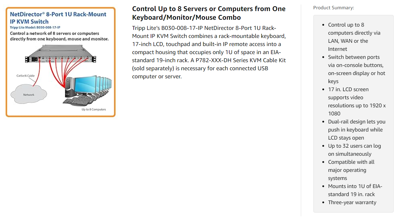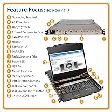 From across the room, down the street or halfway around the globe, you can access and control up to eight connected computers or servers from any computer via LAN, WAN or Internet. Easy to install and use, the B030-008-17-IP lets you handle complex problems without needing to be on-site, which saves money and time. It supports IPv4, IPv6 and network interfaces TCP/IP, HTTP, HTTPS, UDP, RADIUS, DHCP, SSL, ARP, DNS, 10Base-T/100Base-TX, Auto Sense and Ping. Windows- and Java-based applications provide access without a browser.