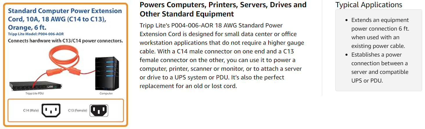 With support for up to 250V, this six-foot 10A cord is compatible with all C13-equipped hardware. It’s UL-listed and features a flexible SJT jacket and 18 AWG wire for easy routing through tight areas.