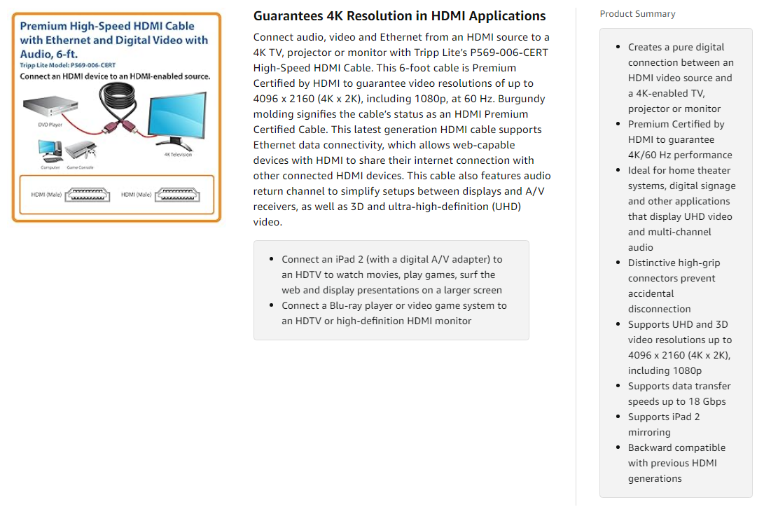 The P569-006-CERT is backward compatible with previous HDMI generations and can be used in any HDMI installation. Its flexible PVC jacket makes it easy to install in tight spaces.