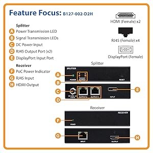 The B127-002-D2H delivers power to the connected receivers over user-supplied Cat6 cabling (such as the Tripp Lite N202-Series), giving you the flexibility to place them where most convenient without needing to be near an AC wall outlet or additional power equipment. Green and orange LED lights on the transmitter and receivers will indicate when the system is receiving power and a signal is being transmitted.