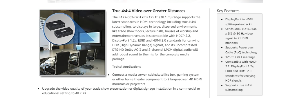 Tripp Lite’s B127-002-D2H kit extends a 4K HDMI video signal up to 125 ft. over Cat6 cable to 2 HDMI monitors. The kit includes a 2-port splitter/transmitter that connects to DisplayPort video source devices like media servers or laptops, and transmits their 3840 x 2160 (4K x 2K) @ 60 Hz signal to 2 receivers connected to your displays. Its Power over Cable (PoC) technology means you won’t need a separate power source for the receivers. The included mounting hardware lets you install the receivers on walls, poles and racks as part of a system that is ideal for extending displays beyond the normal range of A/V cabling with a minimal equipment footprint.