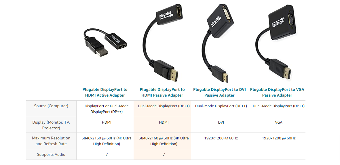 Plugable's DisplayPort to HDMI passive adapter (DPM-HDMIF) allows you to connect from a Dual-Mode DisplayPort (DP++) output on your laptop, desktop, or tablet to virtually any HDMI-enabled display.