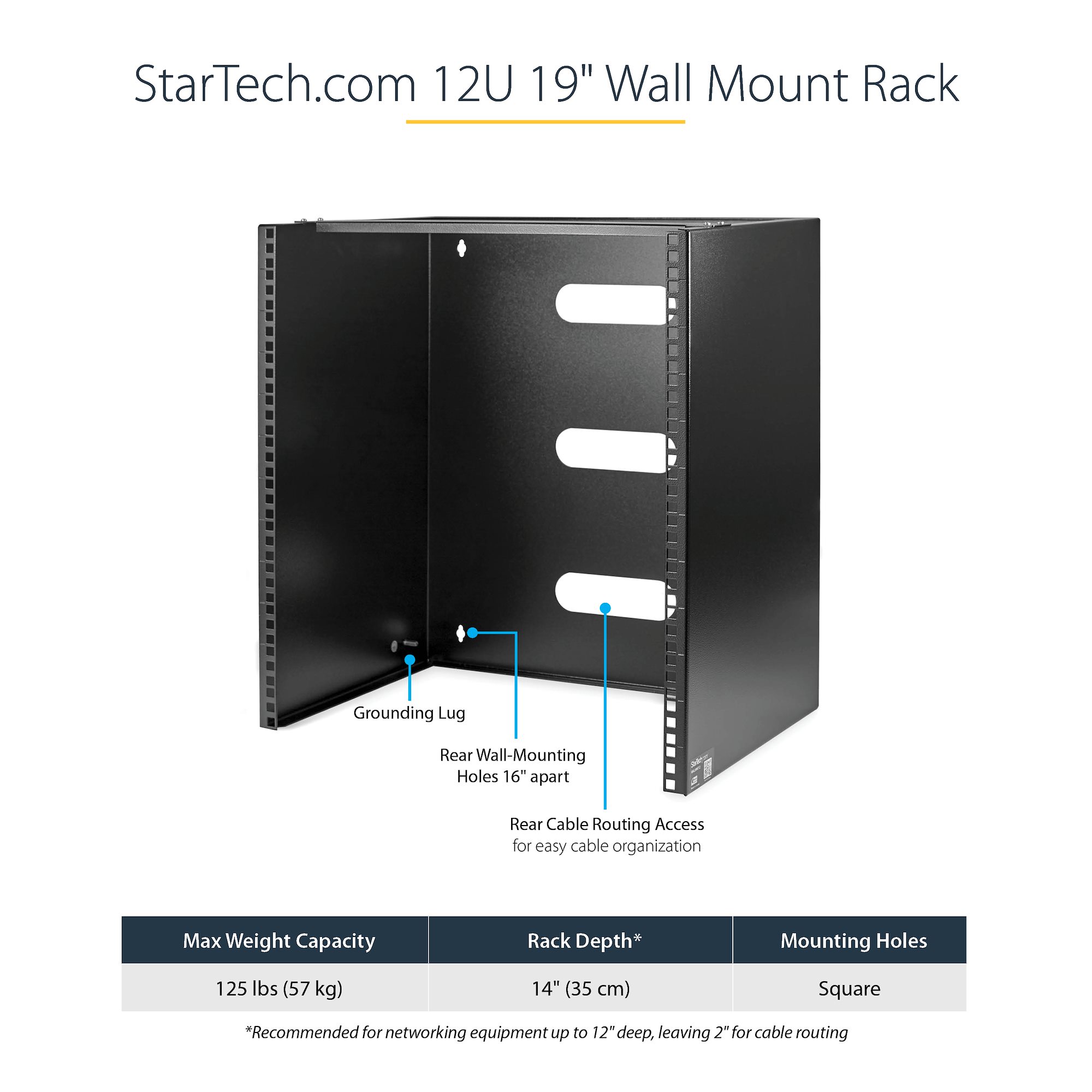 This wall-mount bracket provides 12U of space for mounting shallow rack-mount equipment that's 13.75 in. (34.93 cm) deep or less to the wall, such as patch panels or network switches.