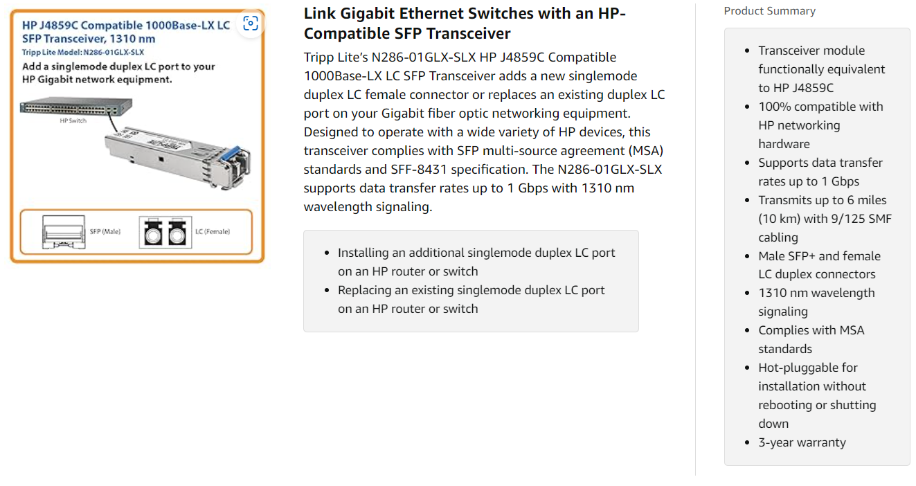 The N286-01GLX-SLX functions just like the HP J4859C transceiver module and is manufactured to meet or exceed HP specifications. You can use this transceiver with many HP routers and switches and receive the same performance as the J4859C.