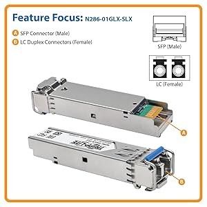 The N286-01GLX-SLX transmits across six miles (10 kilometers) of 9/125 singlemode fiber (SMF) cabling. It features a 1310 nm wavelength vertical-cavity surface-emitting laser (VCSEL). It meets IEEE 802.3z standards. The N286-01GLX-SLX also supports DDM, so you can monitor optical output power, optical input power, temperature, laser bias current and transceiver supply voltage.
