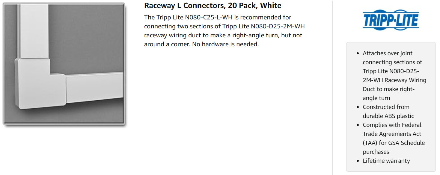 Made from durable ABS plastic, the one-piece N080-C25-L-WH is colored white to blend elegantly into any home or office décor for a sleek, professional installation. It snaps directly over the raceway joint to hold the two sections together.