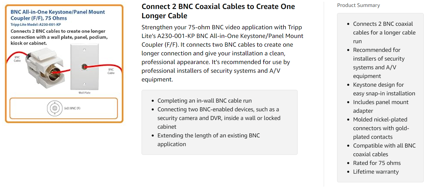 Compatible with all BNC coaxial cables, the A230-001-KP features molded nickel-plated connectors with gold-plated contacts for optimum transmission of a video signal. A heavy-duty plastic housing provides years of successful connections.