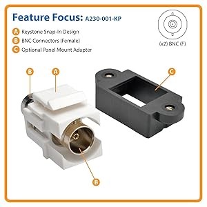 Versatile Keystone Design with Optional Panel Mount AdapterThe A230-001-KP snaps easily into the cutout of a standard data wall plate or patch panel. Or you can secure it to a podium, kiosk or locked cabinet with the included panel mount adapter. Connected devices, such as security cameras and surveillance DVRs, can be hidden out of sight behind a wall or inside a cabinet. Hardware for installing the panel mount adapter is included. |