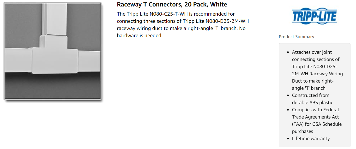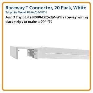 Made from durable ABS plastic, the one-piece N080-C25-T-WH is colored white to blend elegantly into any home or office décor for a sleek, professional installation. It snaps directly over the raceway joint to hold the three sections together.