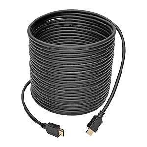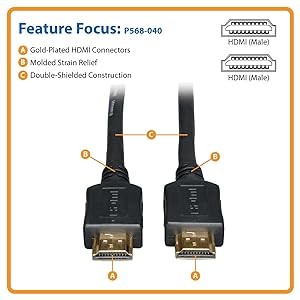This 40-foot molded 28 AWG cable features premium foil-and-braid shielding as well as paired video wire construction to deliver top-of-the-line signal quality and protection from EMI/RFI interference. Gold-plated HDMI connectors with gold-plated copper contacts ensure excellent conductivity. Integral strain relief guarantees long life and durability.