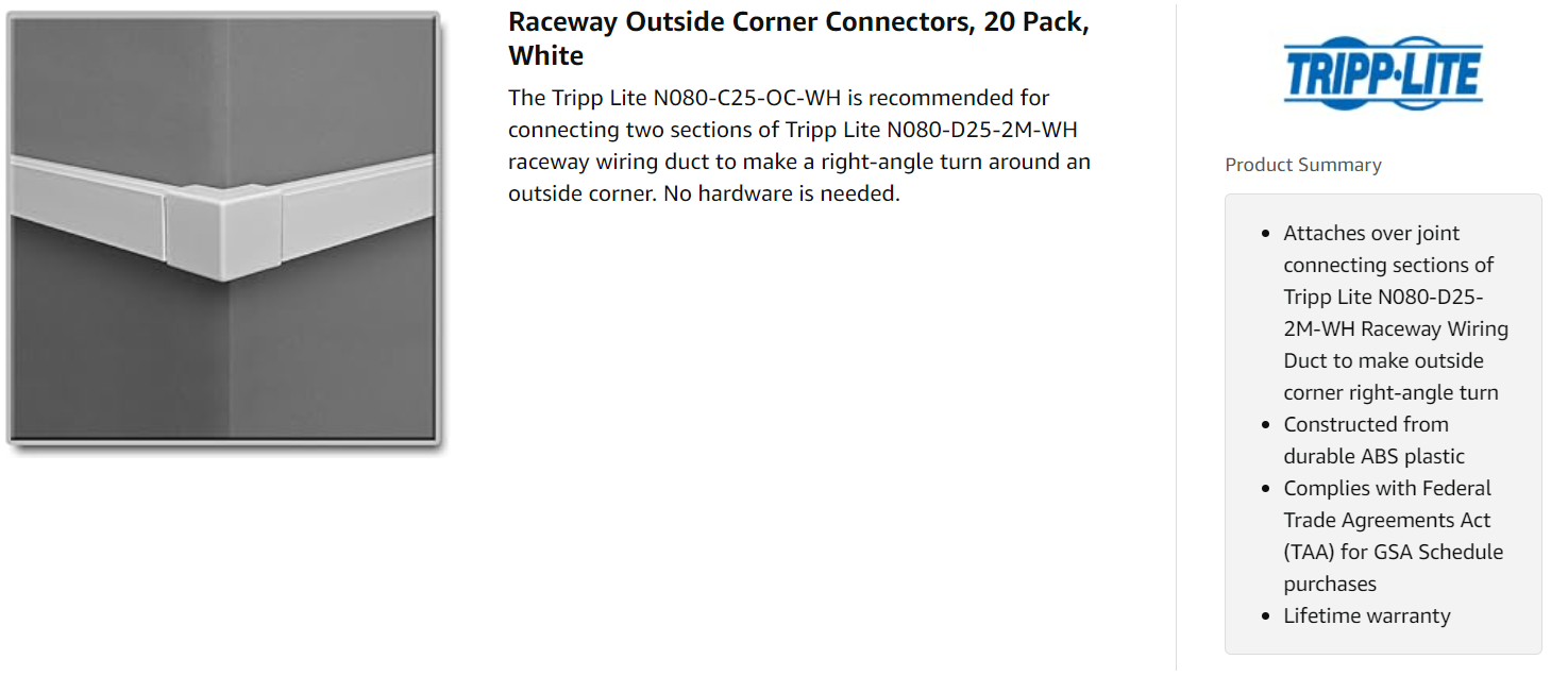 Made from durable ABS plastic, the one-piece N080-C25-OC-WH is colored white to blend elegantly into any home or office décor for a sleek, professional installation. It snaps directly over the raceway joint to hold the two sections together.