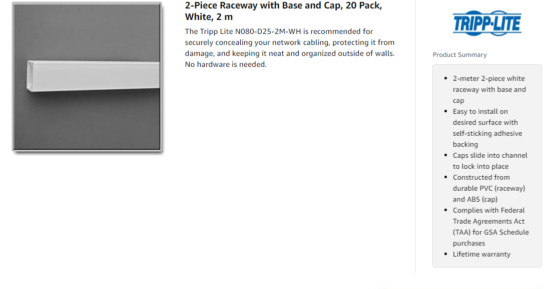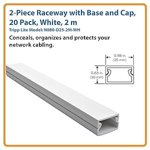 The durable PVC raceway base and ABS plastic cap are colored white to blend elegantly into any home or office décor for a sleek, professional appearance. The N080-D25-2M-WH comes with 20 sets of white two-meter raceway wiring duct—20 bases and 20 caps. See Tripp Lite’s full line of raceway connectors to complete your system layout.