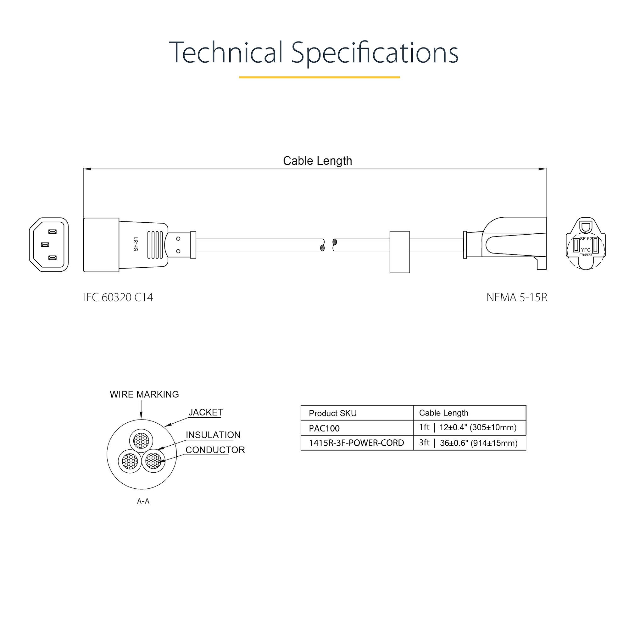 Expertly designed and constructed of high quality materials, this C14 to NEMA 5-15R cable features one hooded (male) power connector and one computer power (female) connector.
