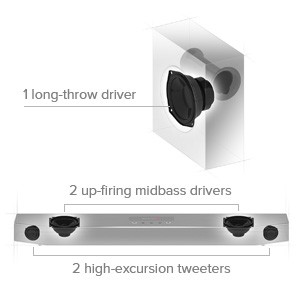 The Katana houses a 5-driver design - two up-firing midbass drivers and two high-excursion tweeters in the soundbar, and one long-throw driver in its subwoofer. Each driver is individually chambered and powered by a DSP-controlled amplifier to deliver ultra-precise audio.