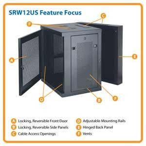 The SRW12US features a sturdy bracket and heavy-duty steel frame that allows the enclosure to be wall mounted—an ideal rackmount solution for any venue where floor space is limited. The SRW12US can also be configured as a freestanding, rollaway floor unit with Tripp Lite's optional Rolling Caster Kit (Model SRCASTER).