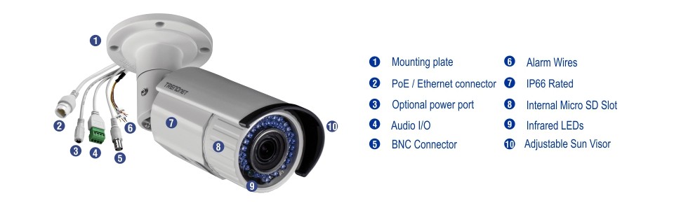 PoE offers cost savings and the flexibility to install this bullet-style outdoor camera in the desired location.