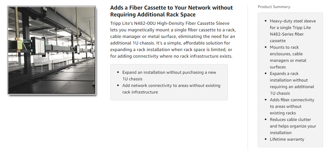 Accommodates a Variety of Cassette TypesThe N482-00U holds a single N482-Series cassette and accommodates LC and MTP/MPO connector types. It allows the interconnection of 10 GbE, 40 GbE and 100/120 GbE equipment, so it’s perfect for a wide variety of network applications. |
