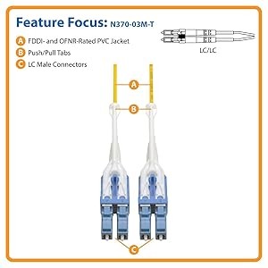 Designed for network equipment that requires singlemode fiber optic patch cables, the N370-03M-T delivers data transfer speeds up to 10 Gbps with higher bandwidth than multimode cable. Attenuation loss meets or exceeds industry standards.