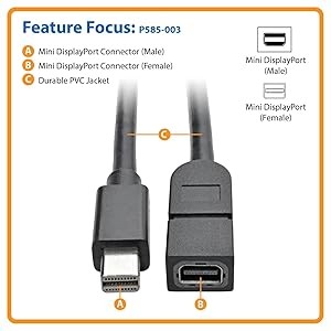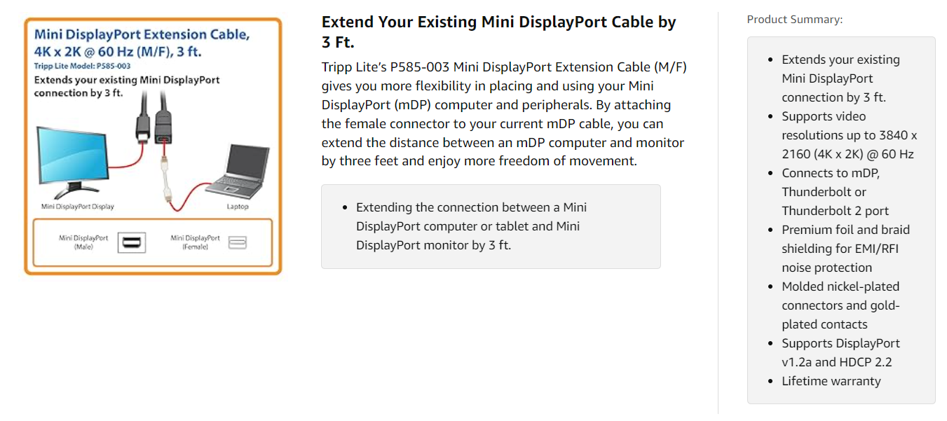 Supports 4K x 2KThis three-foot cable connects to any computer, laptop, mobile device or display that features an mDP, Thunderbolt or Thunderbolt 2 port. It supports Ultra High Definition video resolutions up to 3840 x 2160 (4K x 2K) at 60 Hz. You can stream digital video and audio from an mDP-enabled device, such as a MacBook, Surface Book or Surface Pro 4. The P585-003 supports DisplayPort v1.2a and HDCP 2.2. |