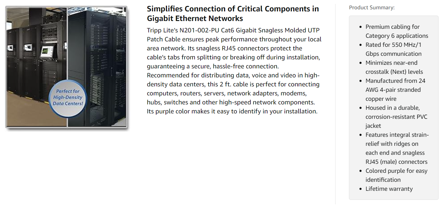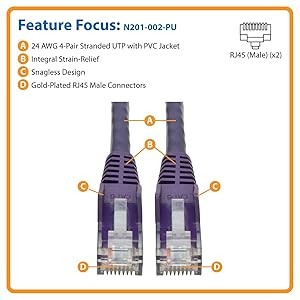 When you choose this genuine Tripp Lite cable, you get superior performance plus peace of mind. We’re so confident of its quality that we warrant it to be free from defects in material and workmanship for life! The N201-002-PU is also manufactured in compliance with strict RoHS specifications, reflecting Tripp Lite’s commitment to environmental responsibility.