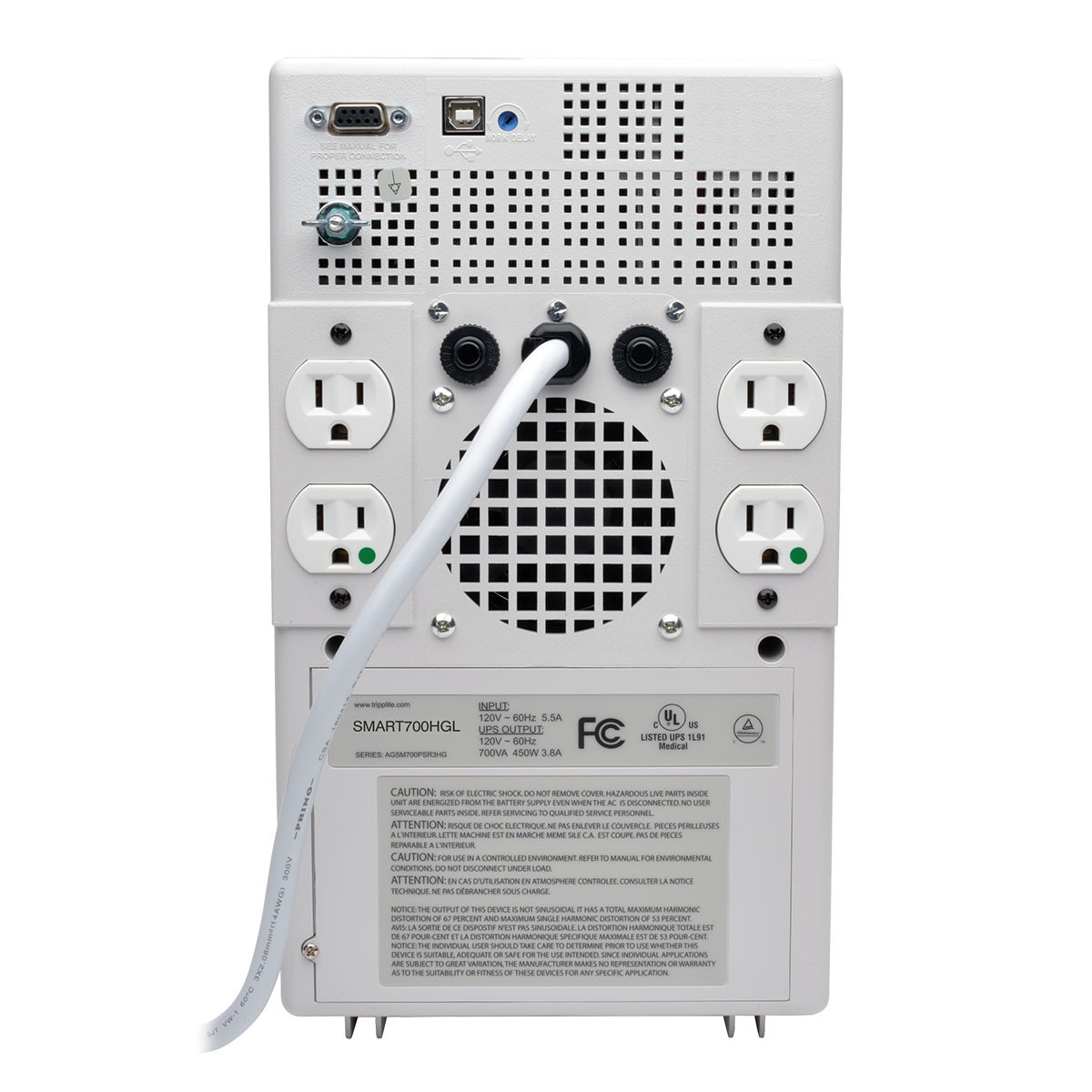 The Tripp Lite SMART700HGL Medical-Grade Line-Interactive UPS System is ideal for use in operating rooms, patient-care vicinities, therapy rooms, imaging environments and administrative areas. This UPS system’s lithium iron phosphate (LiFePhos) battery provides up to 10,000 cycles, 20-30 times as many cycles as traditional batteries. This 700VA, 450W UPS features four NEMA 5-15R-HG hospital-grade outlets and a NEMA 5-15P-HG hospital-grade plug.