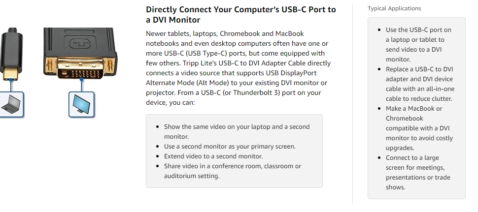 Display High-Definition Video on a DVI MonitorThis adapter cable supports USB DisplayPort Alternate Mode for transmitting high-definition video: - Video resolutions up to 1920 x 1080 at 60 Hz (including 1080p). - 36-bit Deep Color (12 bits per channel). - DVI digital transfer rates up to 6.75 Gbps (2.25 Gbps per channel). - USB 3.1 Gen 1 data transfer rates up to 5 Gbps. |