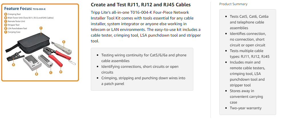 Just by flipping a switch, the T016-004-K tests wiring continuity for Cat5, Cat6, Cat6a and telephone cable assemblies before or after installation. The testers identify a connection, no connection, short circuit or open circuit. Flashing LEDs indicate connection. You can set the LEDs to operate in either fast or slow mode during automatic testing.
