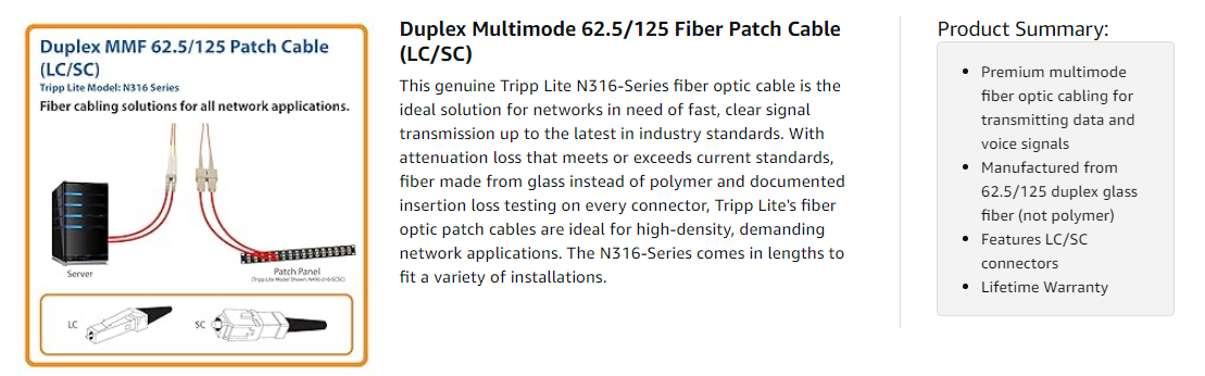 The N316-Series is manufactured using top quality materials. With 62.5/125 duplex fiber, a FDDI and OFNR-rated PVC jacket, sturdy connectors and fiber made from glass instead of a polymer, Tripp Lite's fiber optic cables are made to last in high-demand data center and networking applications.
