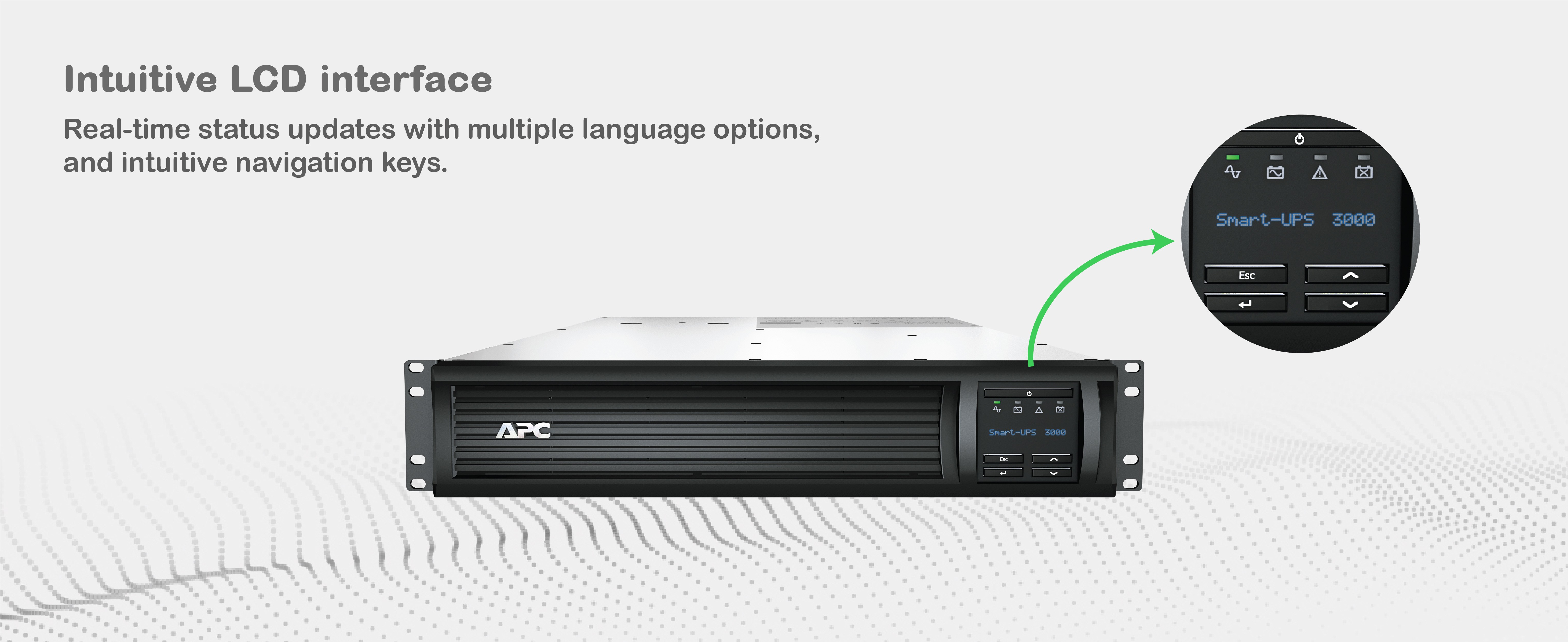 Graphical LCD display Quick, easy-to-read, intuitive LCD provides information about the utility and UPS conditions. |