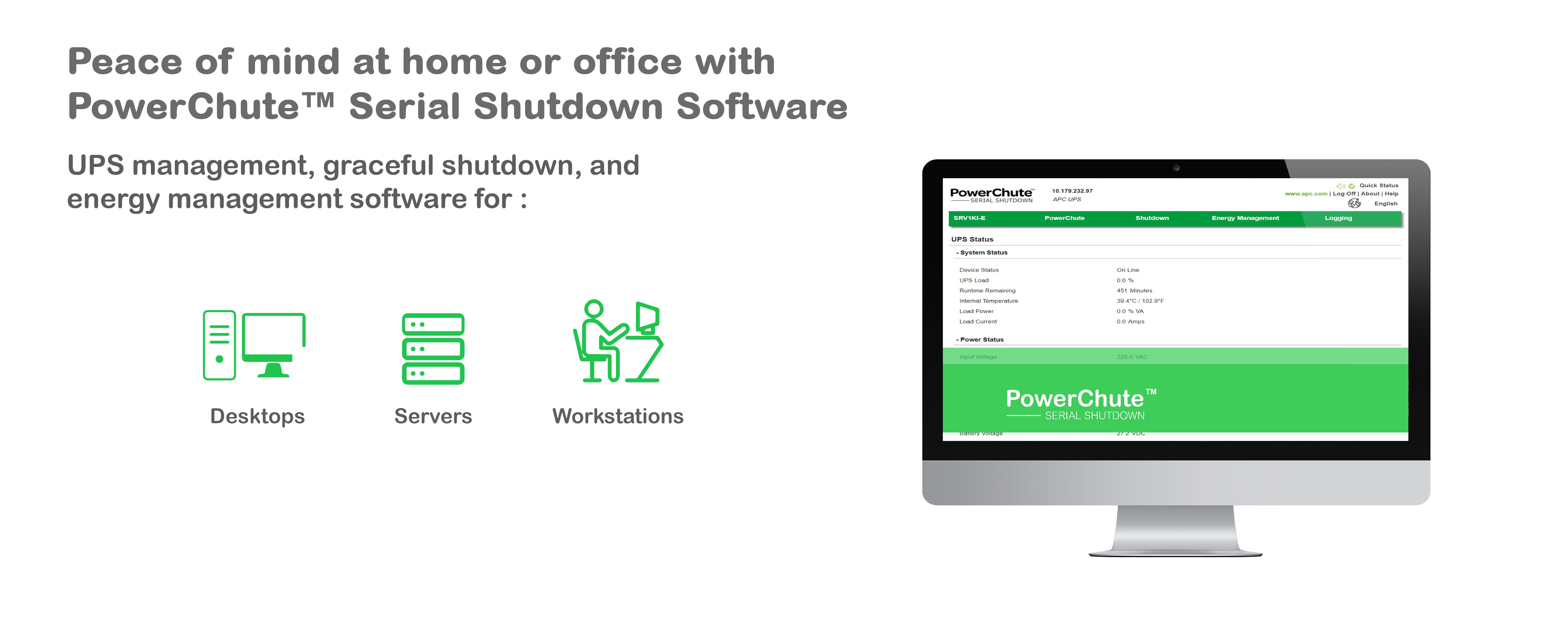 PowerChute Serial Shutdown is available for download from the apc.com. It is a UPS management software enabling graceful system shutdown in the event of an extended power outage and provides energy management capabilities for desktops, servers, and workstations.