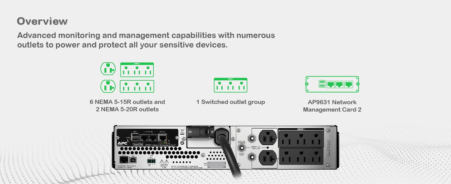 Pre-installed Network Management Card Enables network-based monitoring and management of UPS. |