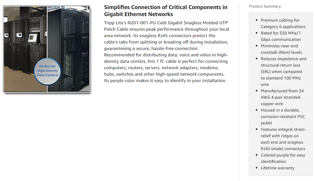 Comes Backed by a Lifetime WarrantyWhen you choose this genuine Tripp Lite cable, you get superior performance plus peace of mind. We’re so confident of its quality that we warrant it to be free from defects in material and workmanship for life! The N201-001-PU is also manufactured in compliance with strict RoHS specifications, reflecting Tripp Lite’s commitment to environmental responsibility. |
