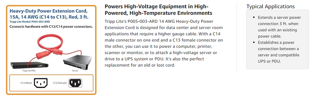 With support for up to 250V, this three-foot 15A cord is compatible with all C13-equipped hardware. It’s UL-listed and features a flexible SJT jacket and 14 AWG wire for easy routing through tight areas.