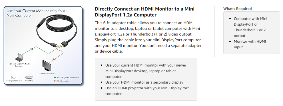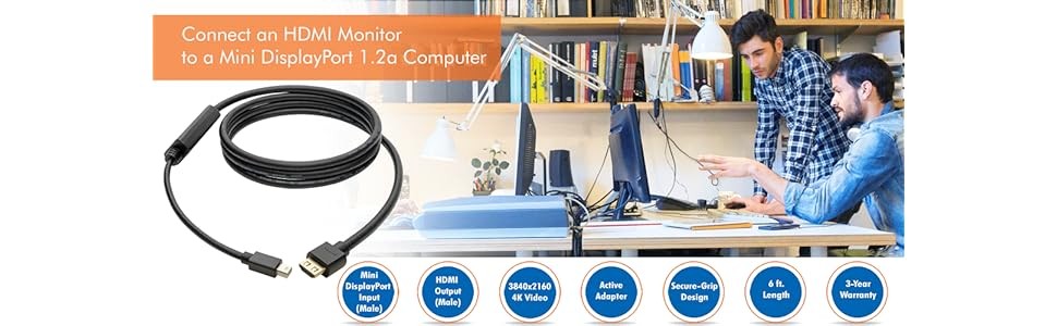 This active adapter cable helps you save money by making your current HDMI monitor compatible with a Mini DisplayPort-equipped computer. High-quality connectors provide maximum conductivity to ensure a clean, consistent video signal.