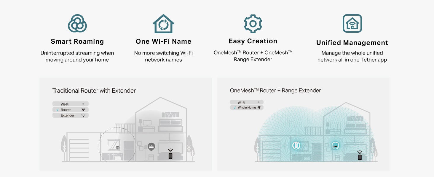 With TP-Link OneMesh technology effortlessly create a Mesh network with a single network name for uninterrupted streaming when moving around your home. Just connect the RE550 range extender to a OneMesh router for a smart roaming experience that can be managed from the TP-Link Tether app.[2]