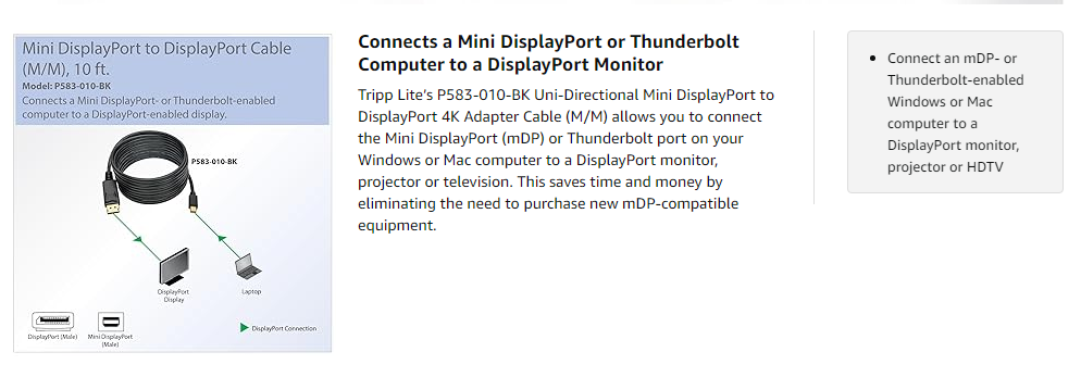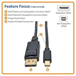 This black, 10-foot cable meets DisplayPort 1.2 specifications and is backward compatible with previous DisplayPort versions. With premium foil-and-braid shielding, it delivers reliable, error-free signal quality and protection from EMI/RFI interference. Gold-plated connectors and contacts ensure excellent conductivity. Integral strain relief provides flexibility so the cable and connectors can move freely without cracking. To prevent accidental disconnection from a monitor, the P583-010-BK features a locking DisplayPort connector.
