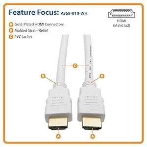 Gold-Plated Connectors and Double-Shielded Construction Provide Superior SignalManufactured using top-quality materials, the P568-010-WH creates a pure digital connection between HDMI-enabled digital display devices and HDMI-enabled digital source devices. The connectors are gold plated for optimal signal transfer. Premium foil and braid shielding protect against EMI/RFI noise. The P568-010-WH has molded construction with integral strain-relief for durability and long life. A flexible white PVC jacket makes the P568-010-WH easy to install, even in tight corners and other areas where space is restricted. This cable is HDCP 2.2-compliant. |