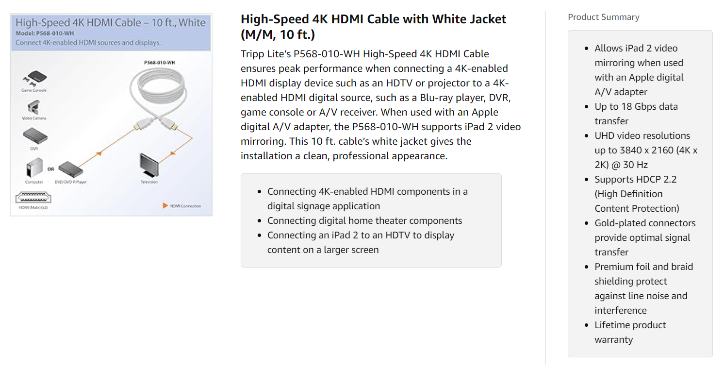 The Smart Solution for Home Theater and Digital Signage ApplicationsWith the P568-010-WH, uncompressed digital video and multi-channel audio signals travel through a single cable to provide superior picture and sound. Perfect for home theater setups and digital signage installations, the P568-010-WH supports full 1080p resolution as well as Ultra High Definition (UHD) resolutions up to 3840 x 2160 (4K x 2K) @ 30 Hz to accommodate the latest high-definition devices. It also supports data transfer speeds up to 18 Gbps. |