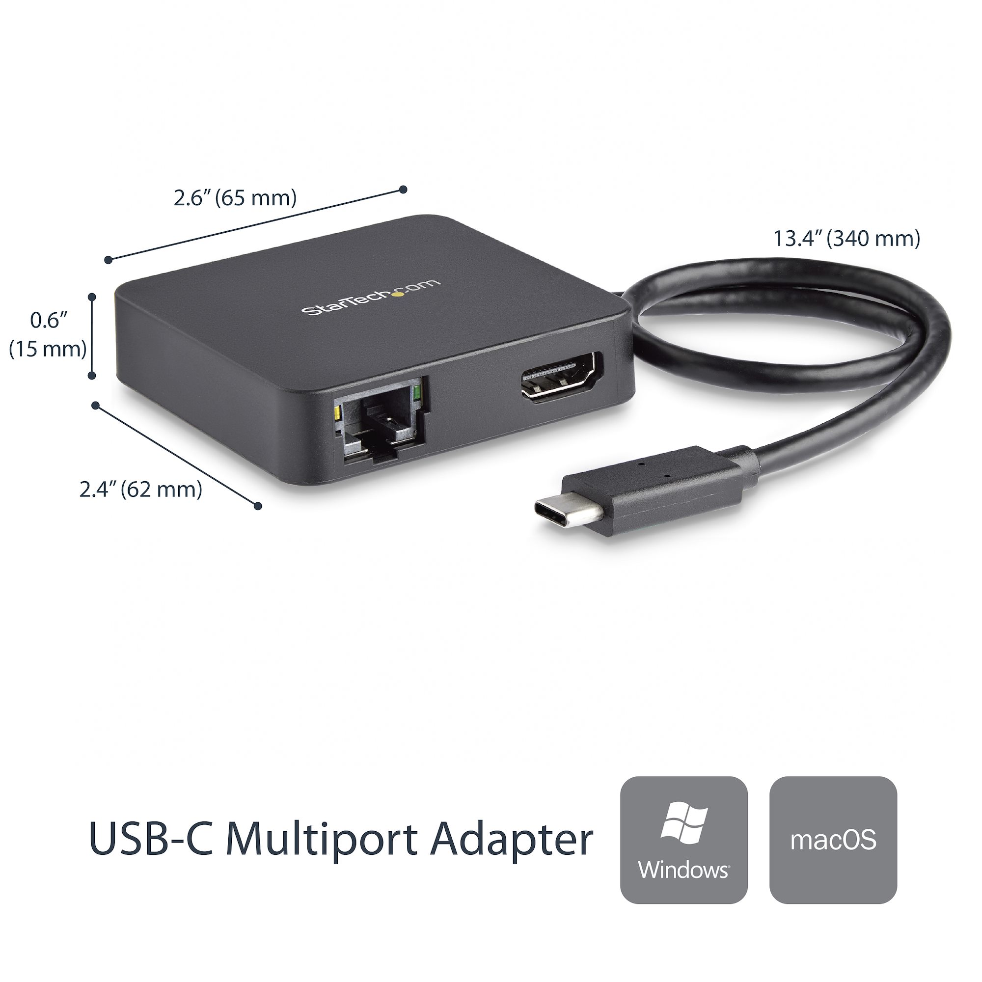 This USB-C Multiport Adapter with HDMI combines the capability of three single-function adapters, a USB-C video adapter, USB-C to USB 3.0 adapter, and Gigabit Ethernet adapter, into a portable docking station for your laptop. You can connect a 4K HDMI display and two USB 3.0 devices (1x USB-A, 1x USB-C), and get high-speed network access, all through a single cable.