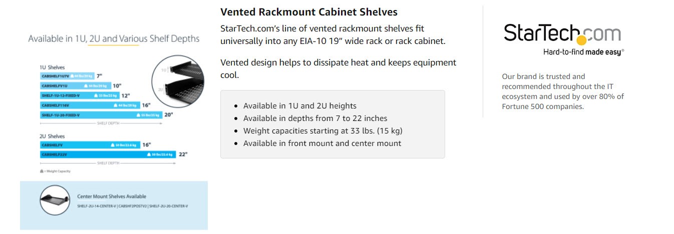 Made from 2mm thick SPCC cold-rolled steel, our family of universal vented rack shelves can be installed in any standard 19” server rack.